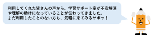 学習サポートは、教科書の疑問点からレポート作成のアドバイスまで、大学院生チューターが皆さんの学習を幅広く支援する活動です。